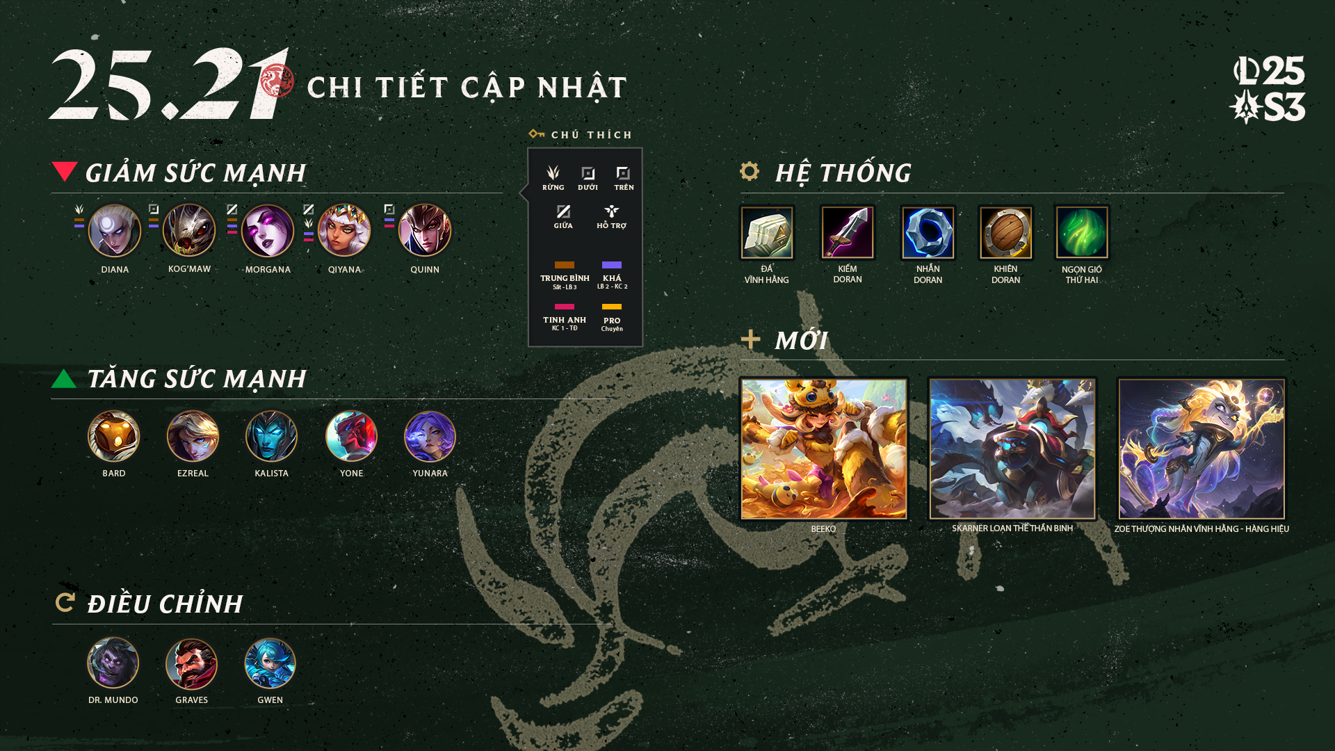 Bản cập nhật 25.21 sẽ đến cùng battle pass trong mùa cuối cùng của năm nay! Hãy nhớ hoàn thành battle pass để nhận Beeko, Skarner Loạn Thế Thần Binh và Zoe Thượng Nhân Vĩnh Hằng - Hàng Hiệu cùng rất nhiều biểu cảm, biểu tượng và hơn thế nữa nhé!